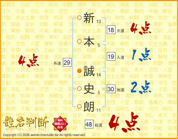 新(13画)本(5画) 誠(14画)史(5画)朗(11画)