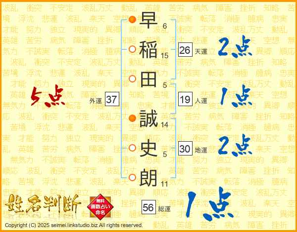 早(6画)稲(15画)田(5画) 誠(14画)史(5画)朗(11画)