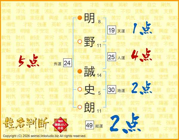 明(8画)野(11画) 誠(14画)史(5画)朗(11画)