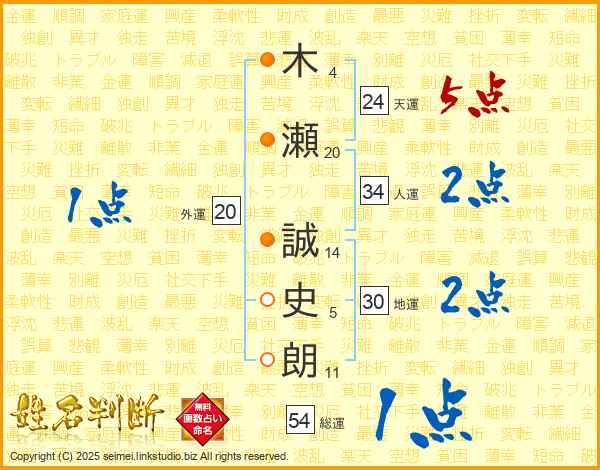 木(4画)瀬(20画) 誠(14画)史(5画)朗(11画)