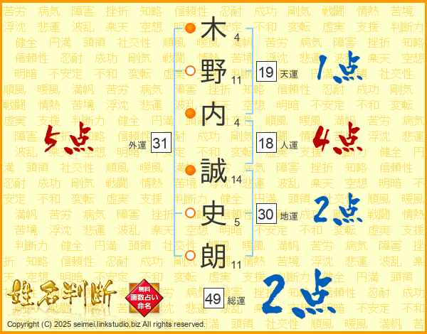 木(4画)野(11画)内(4画) 誠(14画)史(5画)朗(11画)