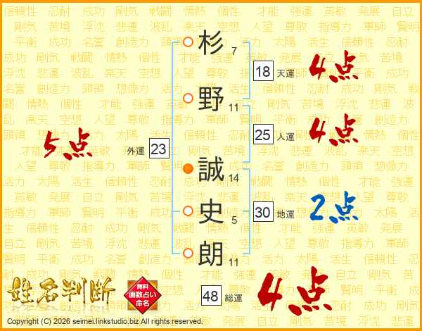 杉(7画)野(11画) 誠(14画)史(5画)朗(11画)