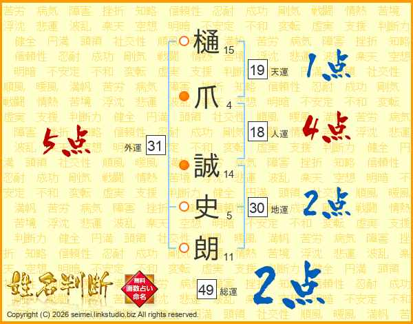 樋(15画)爪(4画) 誠(14画)史(5画)朗(11画)