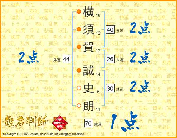横(16画)須(12画)賀(12画) 誠(14画)史(5画)朗(11画)