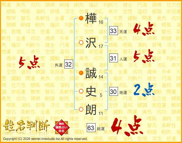 樺(16画)沢(17画) 誠(14画)史(5画)朗(11画)