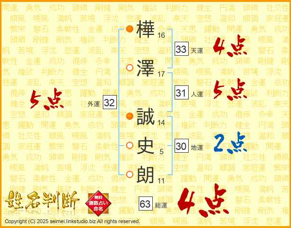 樺(16画)澤(17画) 誠(14画)史(5画)朗(11画)