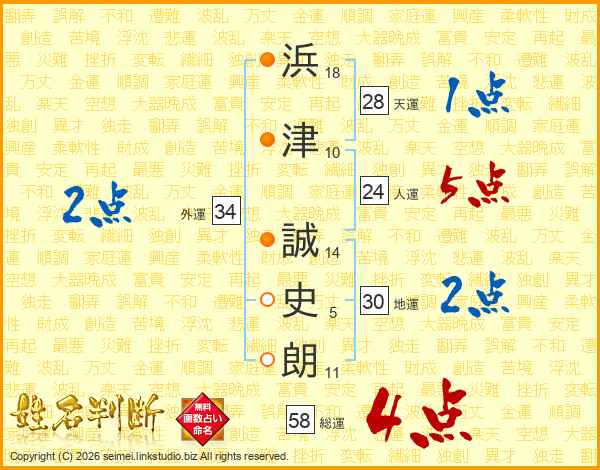 浜(18画)津(10画) 誠(14画)史(5画)朗(11画)