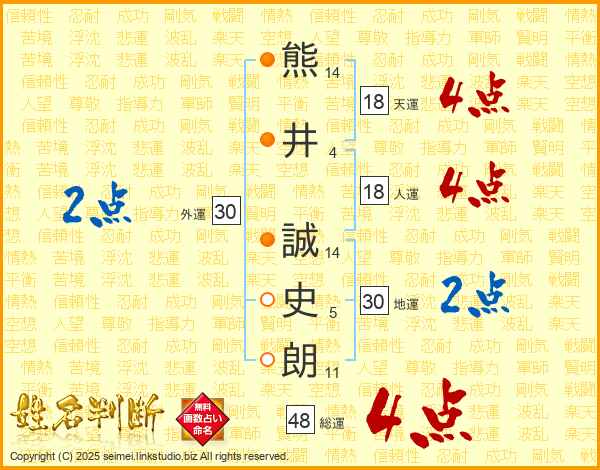 熊(14画)井(4画) 誠(14画)史(5画)朗(11画)