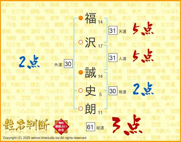 福(14画)沢(17画) 誠(14画)史(5画)朗(11画)