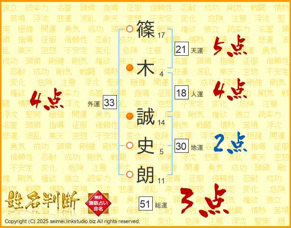 篠(17画)木(4画) 誠(14画)史(5画)朗(11画)