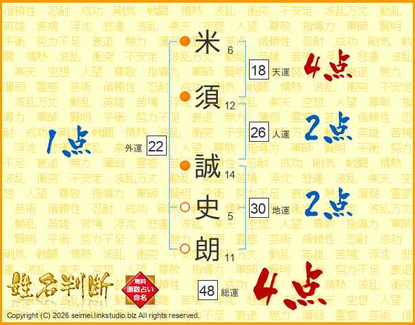 米(6画)須(12画) 誠(14画)史(5画)朗(11画)