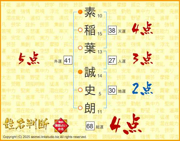素(10画)稲(15画)葉(13画) 誠(14画)史(5画)朗(11画)