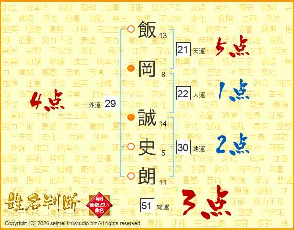 飯(13画)岡(8画) 誠(14画)史(5画)朗(11画)