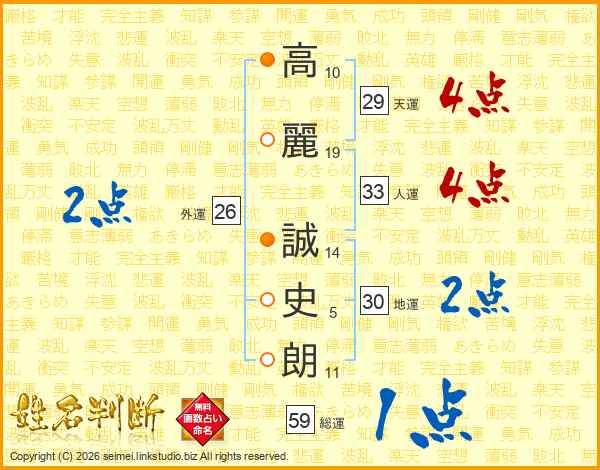 高(10画)麗(19画) 誠(14画)史(5画)朗(11画)
