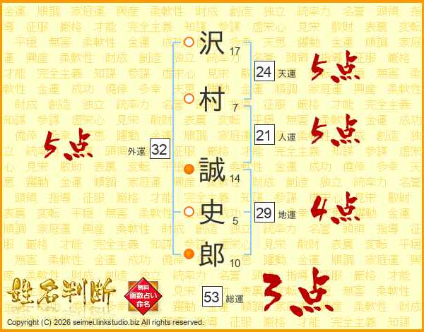 沢(17画)村(7画) 誠(14画)史(5画)郎(10画)