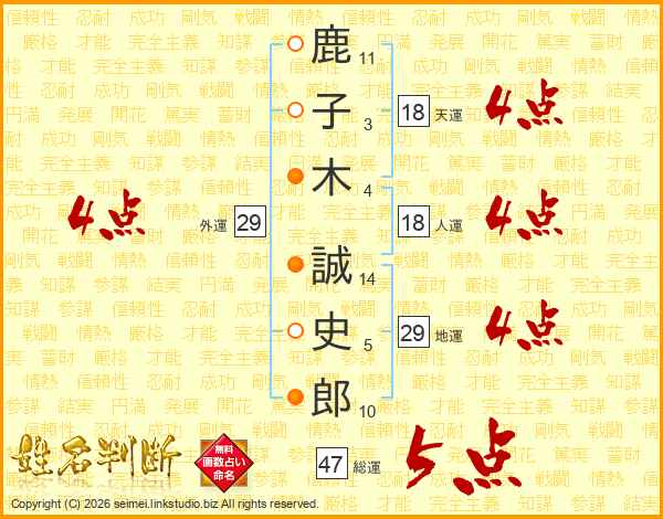 鹿(11画)子(3画)木(4画) 誠(14画)史(5画)郎(10画)