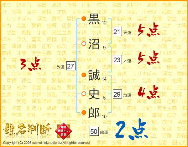 黒(12画)沼(9画) 誠(14画)史(5画)郎(10画)