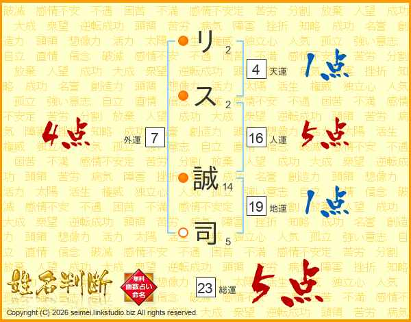 リ(2画)ス(2画) 誠(14画)司(5画)