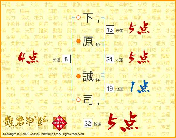 生活面を象徴する運勢です。外部から受ける影響力を表し、結婚運、家庭運や職場、環境への順応性を表します。総運から人運を引いた画数。姓や名が1文字の場合を除く。