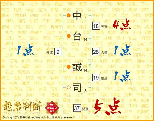 中(4画)台(14画) 誠(14画)司(5画)
