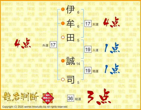 伊(6画)牟(6画)田(5画) 誠(14画)司(5画)