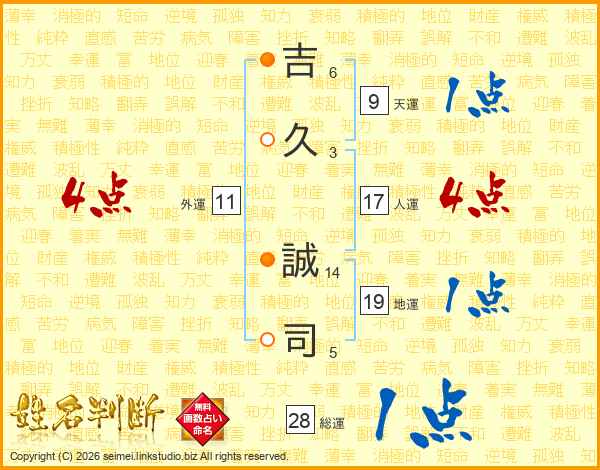 生活面を象徴する運勢です。外部から受ける影響力を表し、結婚運、家庭運や職場、環境への順応性を表します。総運から人運を引いた画数。姓や名が1文字の場合を除く。