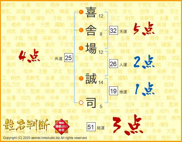 喜(12画)舎(8画)場(12画) 誠(14画)司(5画)