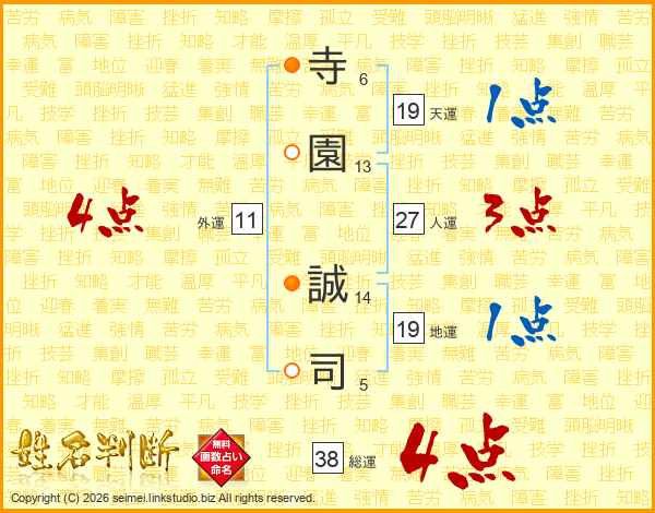 生活面を象徴する運勢です。外部から受ける影響力を表し、結婚運、家庭運や職場、環境への順応性を表します。総運から人運を引いた画数。姓や名が1文字の場合を除く。
