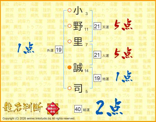 小(3画)野(11画)里(7画) 誠(14画)司(5画)