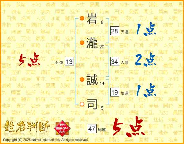 岩(8画)瀧(20画) 誠(14画)司(5画)