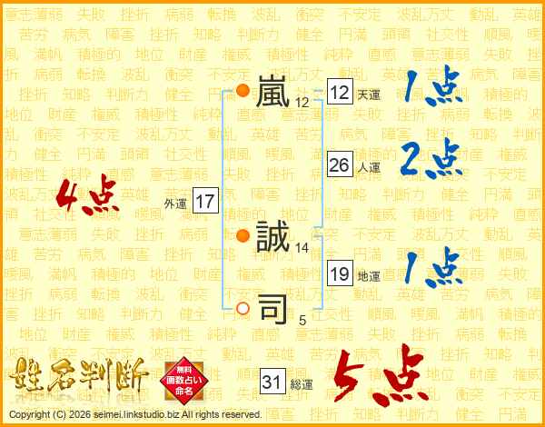 嵐(12画) 誠(14画)司(5画)