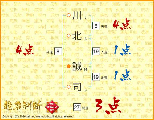 川(3画)北(5画) 誠(14画)司(5画)