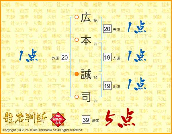 広(15画)本(5画) 誠(14画)司(5画)