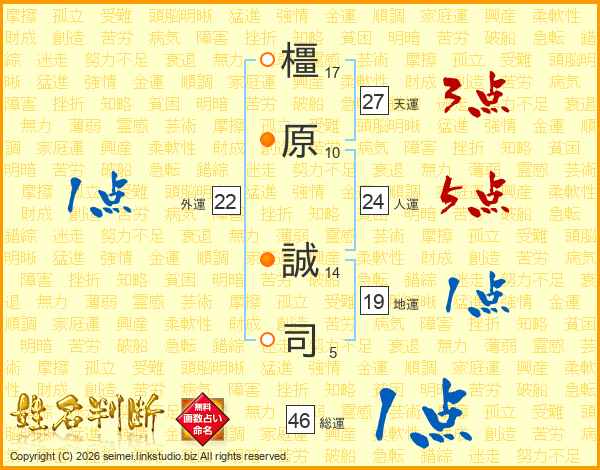あなたの人生を表す1番重要な運勢です。生涯を通じて影響する総合運となり、主に50歳以降の晩年期に影響を及ぼします。苗字と名前の合計画数。