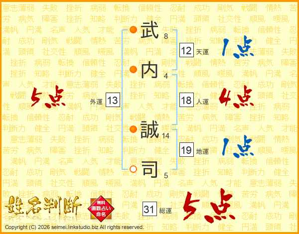 生活面を象徴する運勢です。外部から受ける影響力を表し、結婚運、家庭運や職場、環境への順応性を表します。総運から人運を引いた画数。姓や名が1文字の場合を除く。