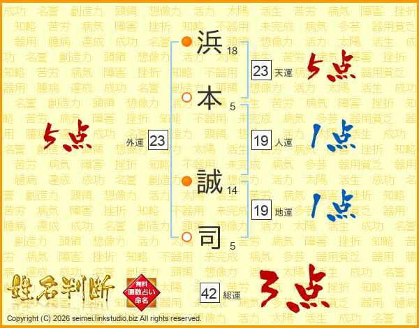 浜(18画)本(5画) 誠(14画)司(5画)