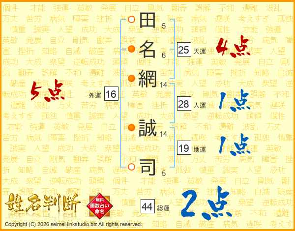 田(5画)名(6画)網(14画) 誠(14画)司(5画)