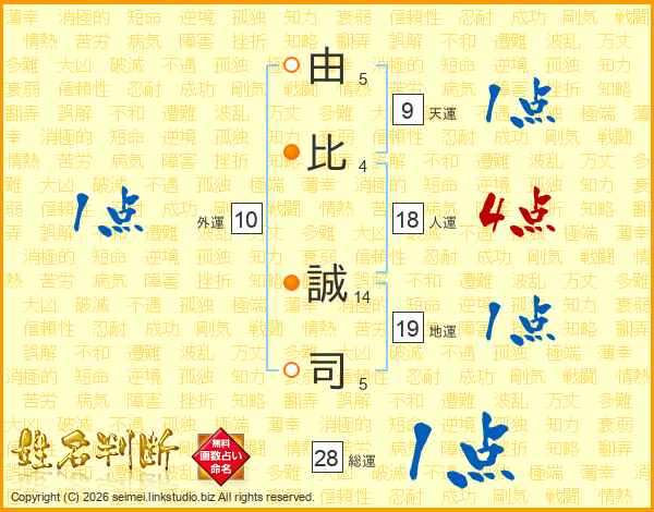 由(5画)比(4画) 誠(14画)司(5画)