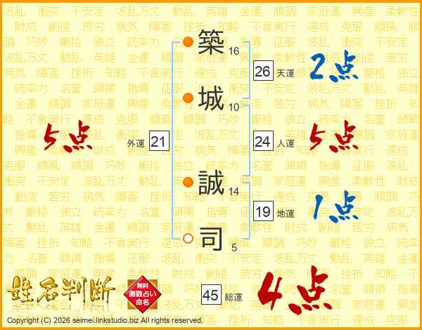 築(16画)城(10画) 誠(14画)司(5画)