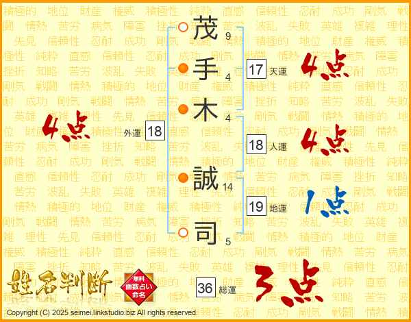 茂(9画)手(4画)木(4画) 誠(14画)司(5画)