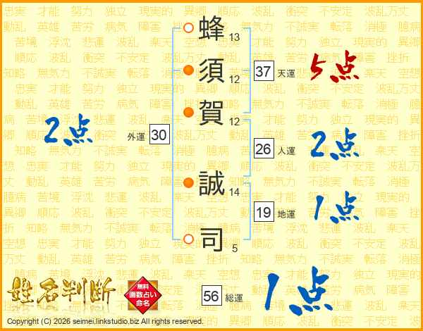 蜂(13画)須(12画)賀(12画) 誠(14画)司(5画)
