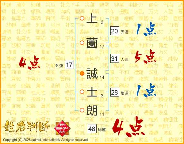 上(3画)薗(17画) 誠(14画)士(3画)朗(11画)