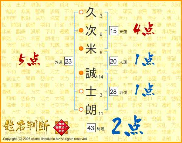 久(3画)次(6画)米(6画) 誠(14画)士(3画)朗(11画)