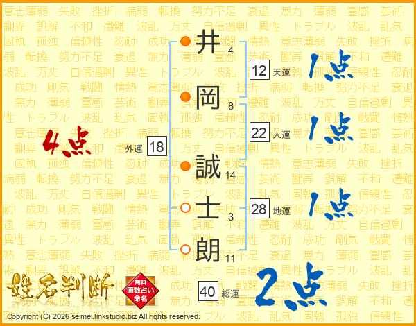 井(4画)岡(8画) 誠(14画)士(3画)朗(11画)