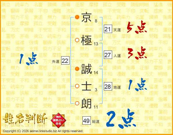 京(8画)極(13画) 誠(14画)士(3画)朗(11画)