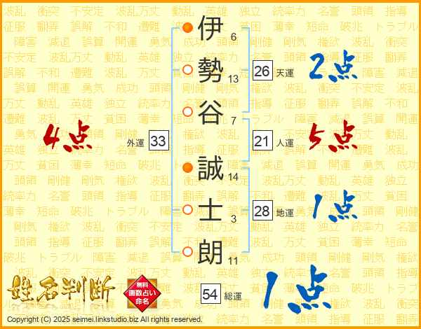 伊勢谷誠士朗さんの総運は54画の1点!