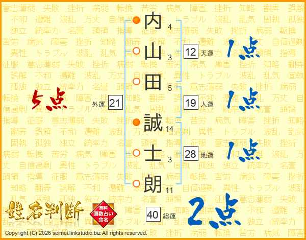 内(4画)山(3画)田(5画) 誠(14画)士(3画)朗(11画)