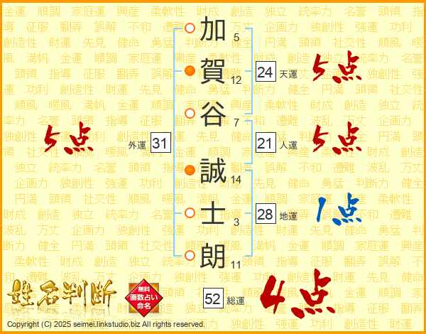 加(5画)賀(12画)谷(7画) 誠(14画)士(3画)朗(11画)