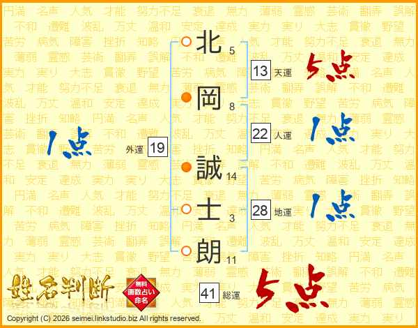 北(5画)岡(8画) 誠(14画)士(3画)朗(11画)