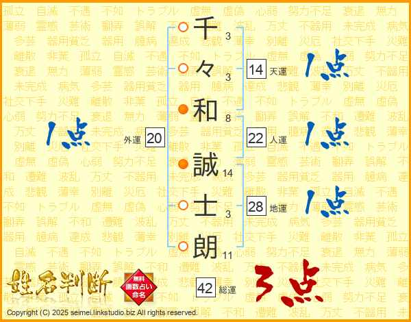 千(3画)々(3画)和(8画) 誠(14画)士(3画)朗(11画)